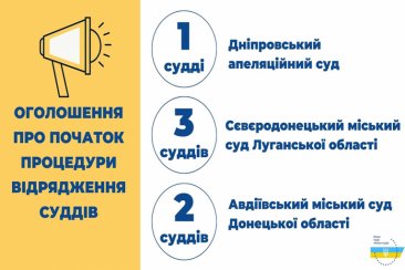 Вища рада правосуддя відповідно до рішень від 12 серпня 2021 року № 1823/0/15-21, № 1824/0/15-21, № 1825/0/15-21 оголошує про початок процедури відрядження суддів до іншого суду того самого рівня і спеціалізації для здійснення правосуддя, а саме до: