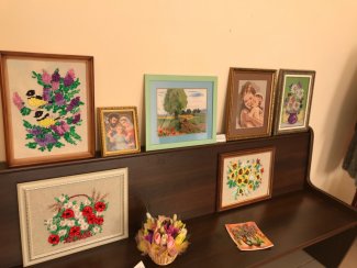 В експозиції представлені вишиті картини, вишиті ікони, в’язані вироби, вироби з бісеру, вишиванки, рушники та серветки. Поряд з картинами також представлені авторські ляльки.