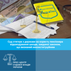 Стягнути з Державного бюджету України на користь 68-річного жителя Черкаської області, шляхом списання з єдиного казначейського рахунку Державної казначейської служби України 3 556 гривень 67 копійок шкоди, завданої законом, що визнаний неконституційним – таке рішення ухвалив Соснівський районний суд міста Черкаси 17 грудня 2019 року за результатами розгляду цивільної справи за позовом до держави України в особі органів державної влади, які уповноважені представляти державу – Головного управління Пенсійного фонду України в Черкаській області, Державної Казначейської служби України про відшкодування шкоди.