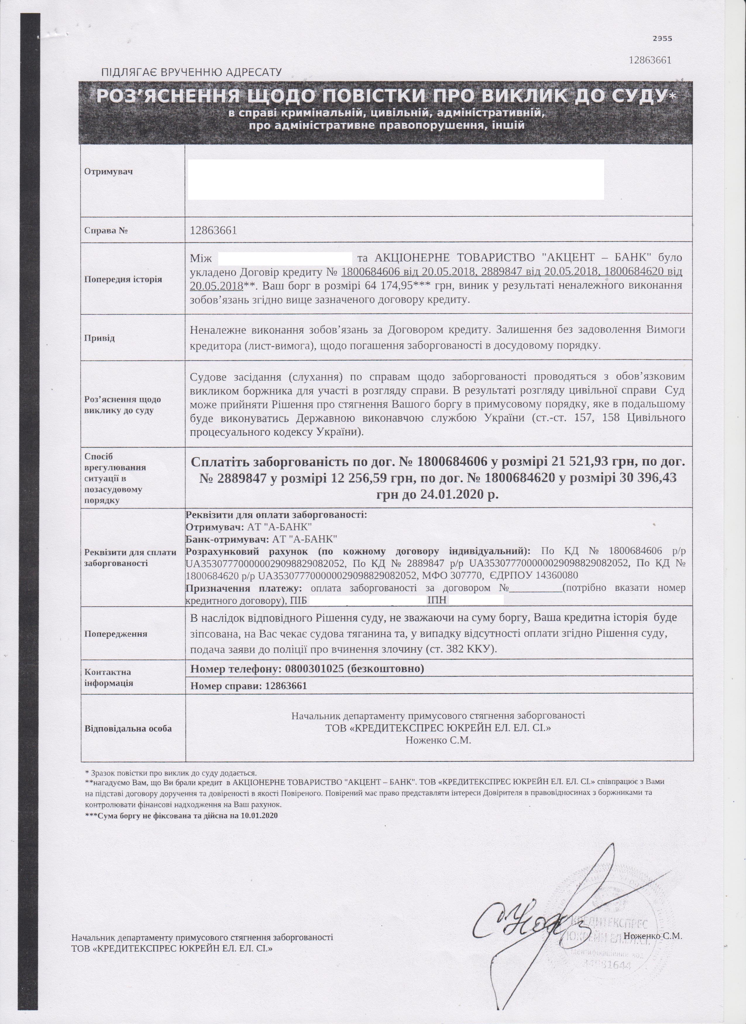Як виявилося, такі документи надсилаються окремими колекторськими фірмами з вказівкою на те, що судову повістку можливо анулювати, сплативши визначену суму на рахунок кредитора.
