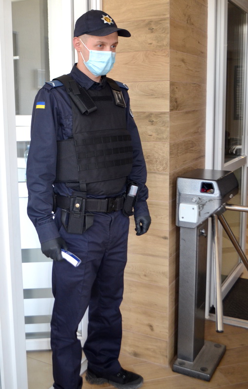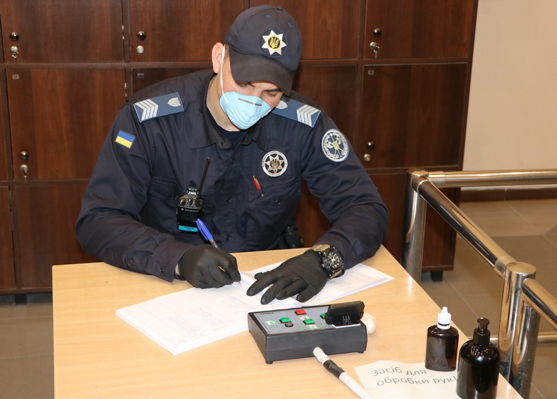 Судові охоронці несуть службу в захисних масках, окулярах і рукавичках, а кожний пункт пропуску забезпечений засобами для дезінфекції рук та предметів.
